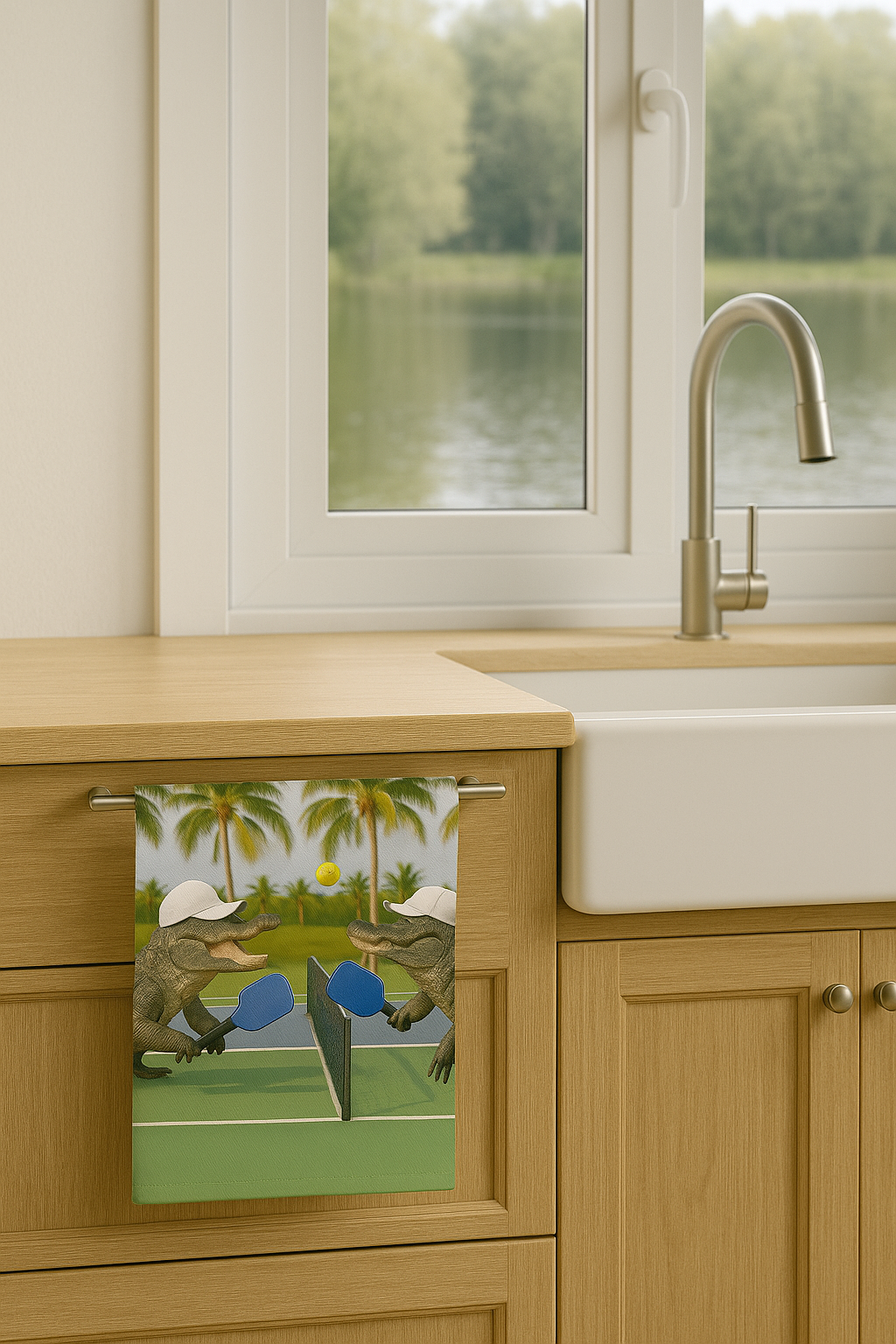 Add a playful twist to your kitchen with our Pickleball Gators Kitchen Towels. Featuring two fun-loving alligators decked out in white caps and ready for a game, this design brings both humor and charm to your everyday routine. Crafted from soft, absorbent fabric, these towels are perfect for drying dishes, wiping counters, or simply adding a splash of personality to your kitchen décor. Durable yet lightweight, they’re as practical as they are entertaining—a conversation starter that makes cleanup a little more fun.